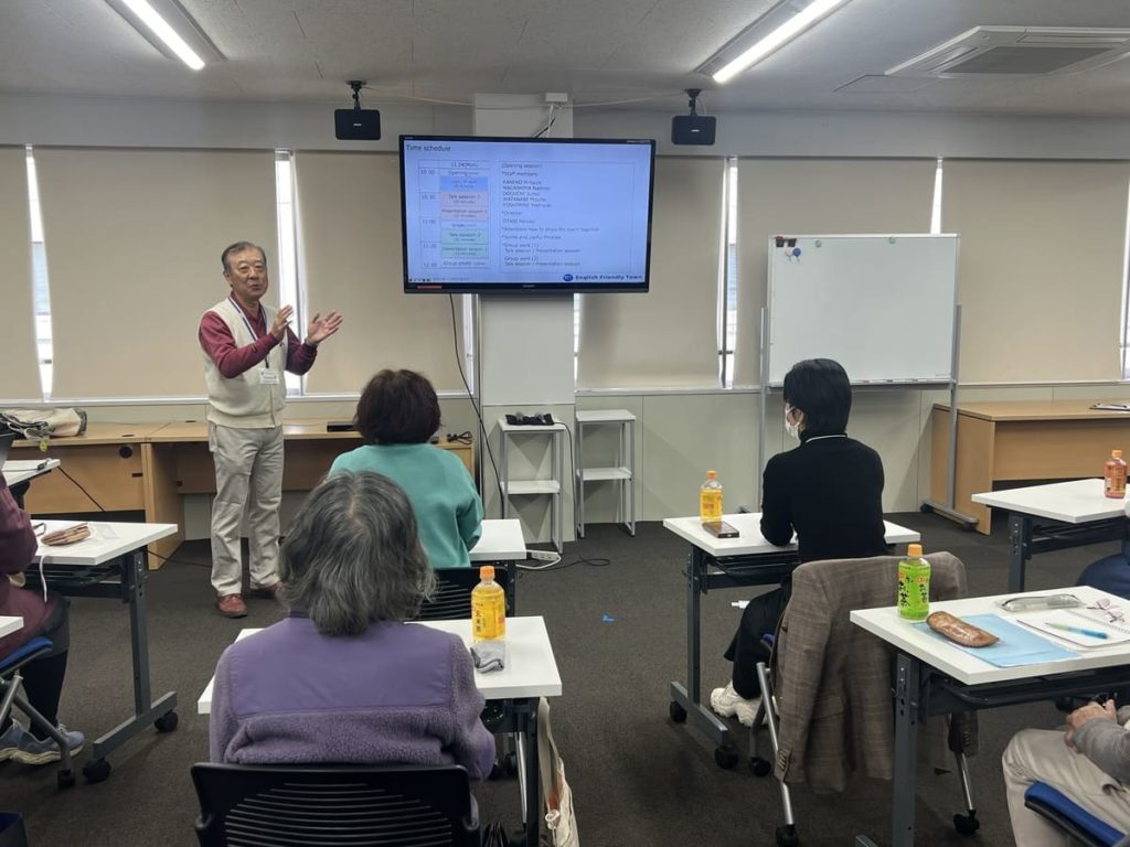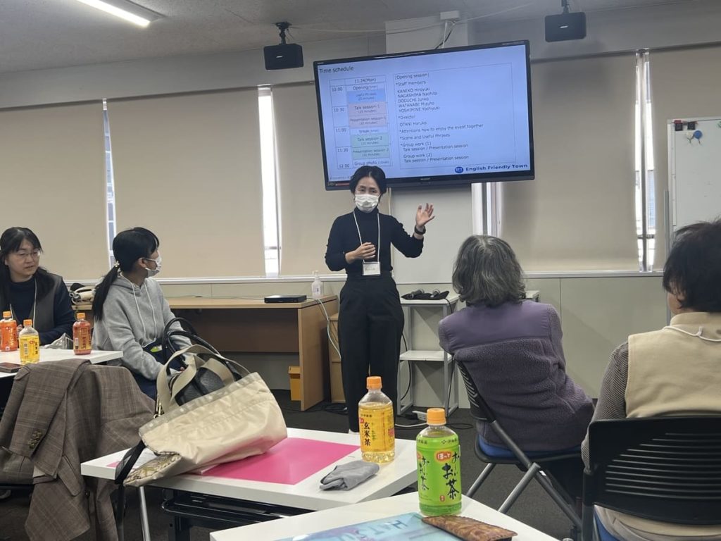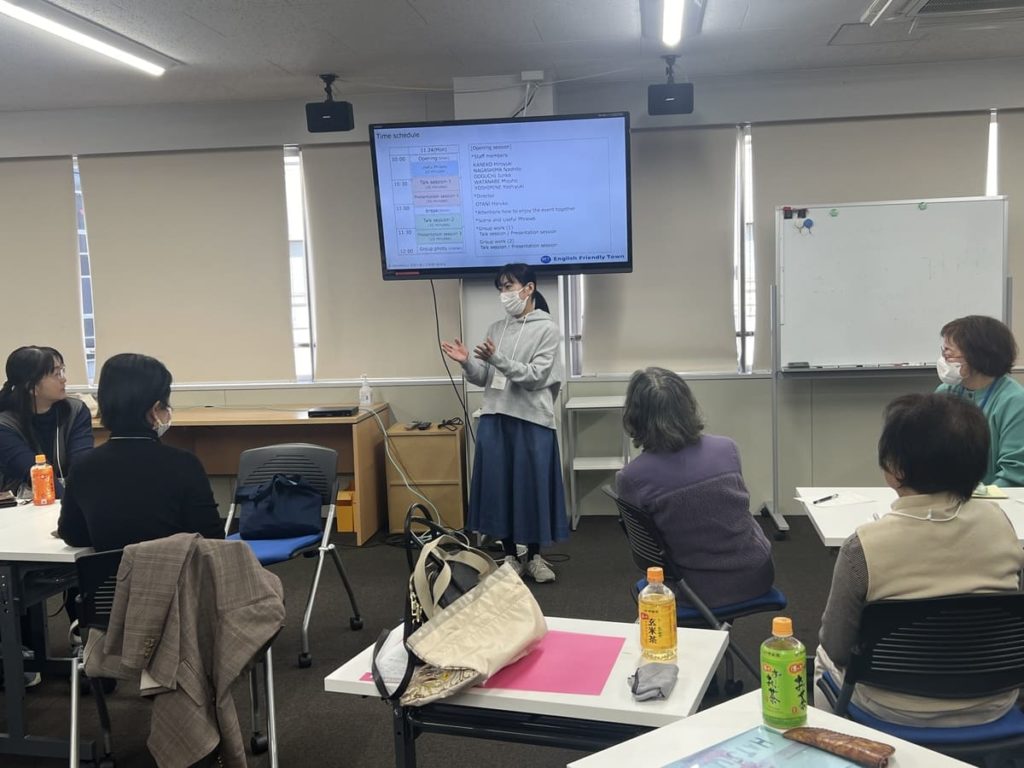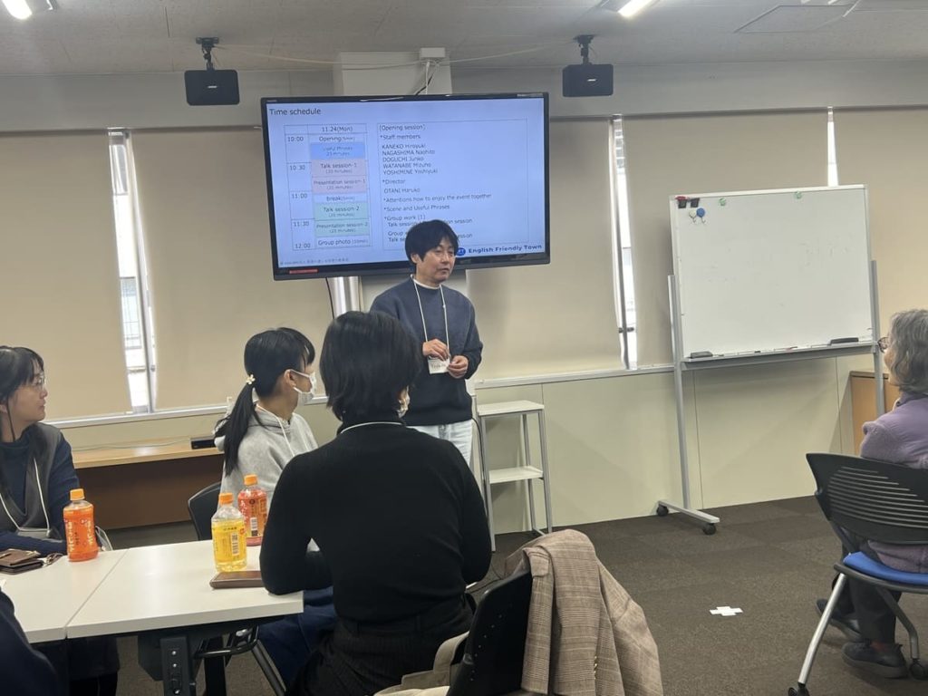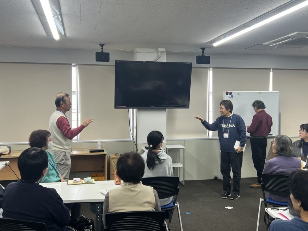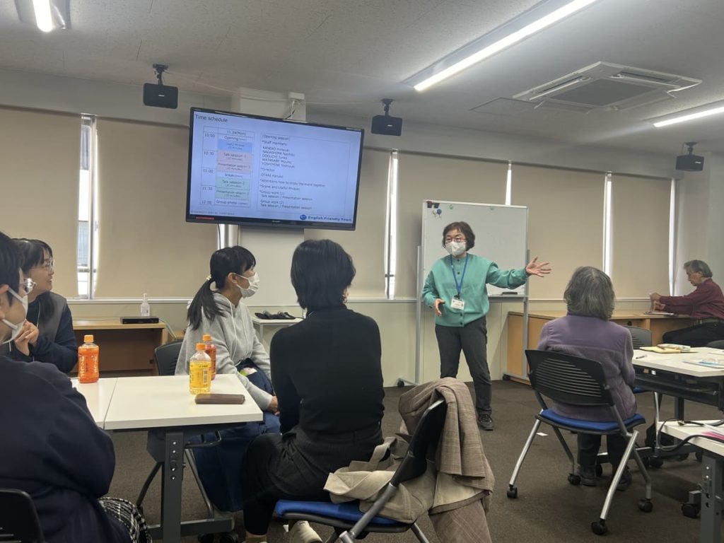 基本的な英語フレーズのレクチャーを受けた後、2グループに分かれて会話をスタートしました。自己紹介や趣味のお話をしながら、レクチャーで紹介されたフレーズを使っていました。次はプレゼンテーションタイム、1人ずつ前に出てグループでどんな事を話し合ったか、とか、最近の出来事などを自由に発表しました。言葉に詰まっても、”Take it easy!”、質問の手が上がらない時は、”Come on!”などの言葉が飛び交い、笑顔が絶えないワークショップになりました。