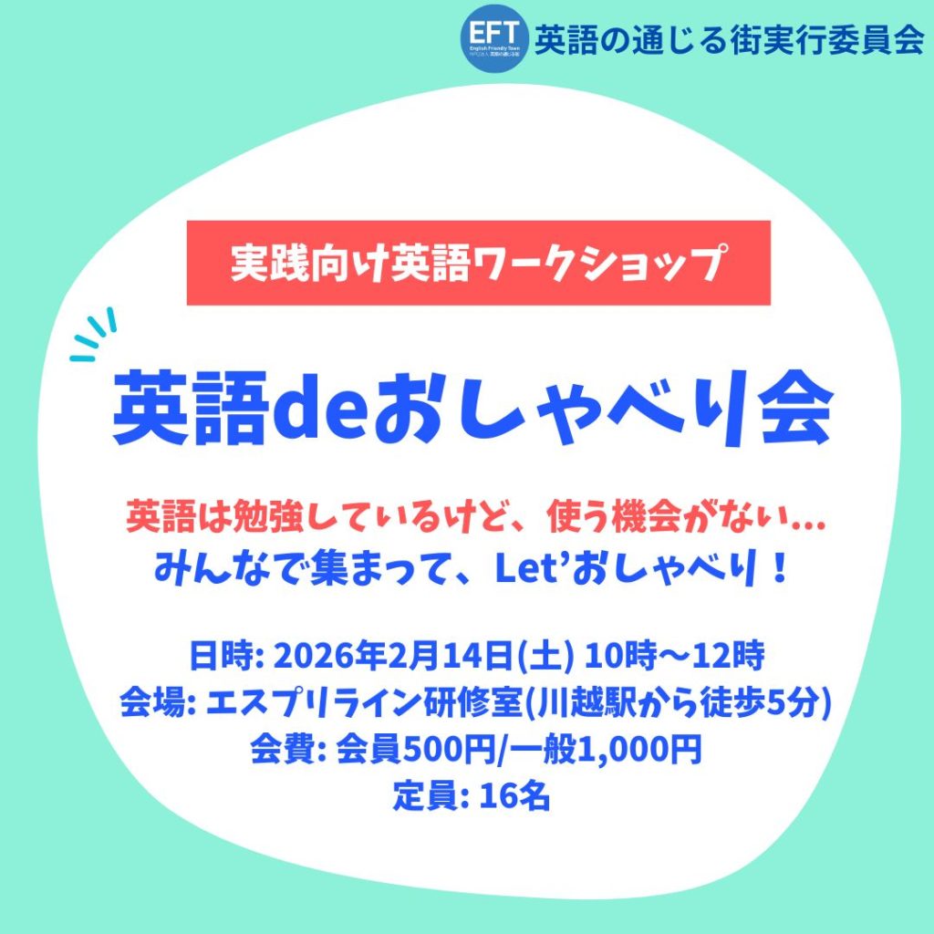 いつも好評をいただいている“英語deおしゃべり会”。今回は、カリフォルニアにお住まいのEFT会員に、40年暮らして知ったアメリカの文化や日本との違いについてお話しいただく予定です。その後、グループに分かれての話し合いや、みんなの前での発表も予定しています。初心者の方でも楽しく英語を話す機会となりますので、是非、ご参加ください!